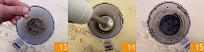 Transfira tudo para um recipiente, adicione uma pitada de sal 13 e bata com um mixer de imersão 14 para obter um creme liso e homogêneo 15.