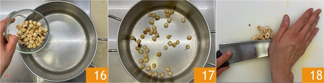 Reserve o creme e cuide das avelãs: coloque-as em uma frigideira 16 e toste em fogo médio-baixo 17. Quando estiverem bem douradas, triture grosseiramente esmagando-as com a lâmina de uma faca 18.
