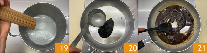 Neste ponto, salgue a água fervente e cozinhe os spaghetti integrais por 2 minutos a menos do que o tempo indicado na embalagem 19. Enquanto isso, despeje o creme de alho negro na frigideira 20 e dilua com uma concha da água de cozimento da massa 21.