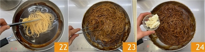 Escorra os spaghetti na frigideira com o molho 22, misture e cozinhe 23. Uma vez que a massa estiver cozida, desligue o fogo e misture com uma colher de manteiga ácida fria da geladeira 24. Misture bem e sirva.
