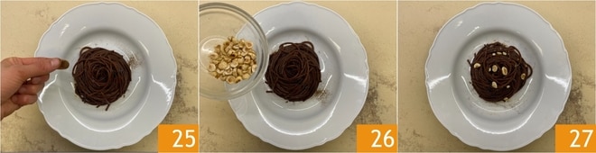 Complete os pratos com uma pitada de alcaçuz em pó 25 e as avelãs tostadas 26. Seus spaghetti com creme de alho negro, alcaçuz e avelãs estão prontos para serem servidos 27!
