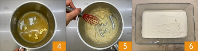 Gire a panela para derreter a manteiga 4, em seguida, adicione a manteiga restante aos poucos procedendo da mesma maneira; à medida que o composto aumenta de volume, use um batedor para misturar 5. Quando toda a manteiga estiver derretida, transfira o creme obtido para um recipiente baixo e largo 6 e coloque na geladeira para esfriar.