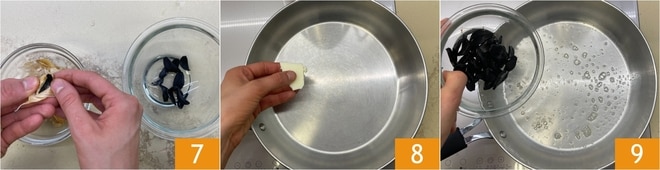 Coloque no fogo uma panela cheia de água para cozinhar a massa e concentre-se no creme de alho: descasque as cabeças de alho negro e retire os dentes 7. Derreta um pedaço de manteiga em uma frigideira 8, depois adicione os dentes de alho 9.