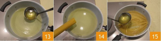 Adicione uma parte do caldo 13 em uma panela e aqueça. Acrescente os spaghetti 14 e cozinhe adicionando mais uma concha de caldo 15 se necessário.