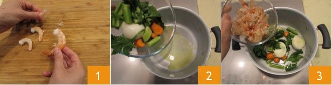 Para preparar os spaghetti com camarões, abobrinhas e brotos de soja, comece fazendo o bisque. Primeiro descasque os camarões 1, coloque a polpa na geladeira e reserve as cascas. Em uma panela, adicione o óleo e acrescente a cebola, o salsão e a cenoura cortados grosseiramente 2. Deixe dourar e, em seguida, adicione as cascas na panela 3.