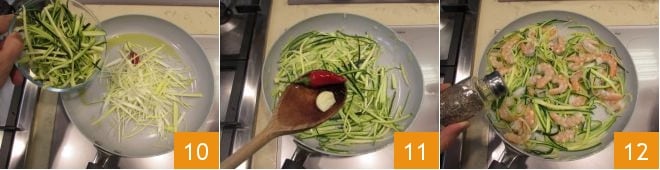 Coloque o óleo em uma panela, adicione o alho e a pimenta (você pode deixá-la inteira ou cortá-la ao meio e retirar as sementes internas) e deixe dourar. Em seguida, adicione tanto o alho-poró quanto as abobrinhas 10 e salteie por alguns minutos. Remova o alho e a pimenta e adicione os camarões. Cozinhe por cerca de 1 minuto, salgue, apimente 12 e desligue o fogo.