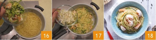 Uma vez que os spaghetti estiverem cozidos, adicione os camarões e as abobrinhas 16, desligue o fogo, acrescente os brotos de soja 17 e salteie tudo por alguns minutos. Sirva seus spaghetti com camarões, abobrinhas e brotos de soja 18 e bom apetite!