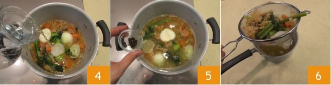 Espere alguns minutos e adicione a água 4. Acrescente alguns grãos de pimenta 5 e deixe cozinhar por cerca de 30 minutos em fogo moderado. Em seguida, coe tudo 6 e reserve o caldo.