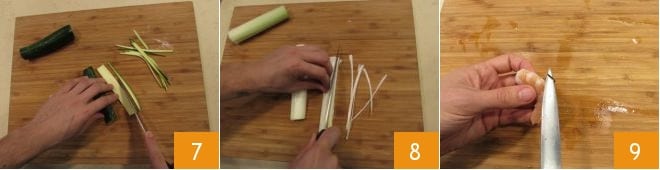 Lave e corte as extremidades das abobrinhas, depois corte-as em fatias e em tiras finas 7. Agora, cuide do alho-poró, elimine a parte verde e corte-o do mesmo tamanho das abobrinhas 8. Pegue os camarões e, com a ajuda de uma faquinha, faça um corte ao longo do dorso e retire o intestino 9.