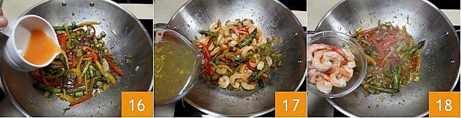 Molhe agora os legumes com o suco da laranja espremida e deixe cozinhar por cerca de dois minutos 16. Se os legumes secarem muito, adicione cerca de dois copos de caldo de legumes, ou caldo de peixe 17. Coloque os camarões previamente descascados e cozinhe no máximo por um minuto, se os camarões que escolheu já estiverem pré-cozidos. Se forem frescos, espere que mudem de cor de acinzentado para laranja avermelhado e então desligue o fogo 18.
