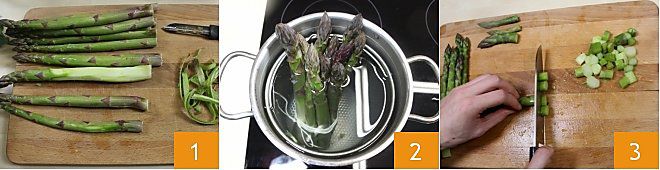 Para preparar o espaguete de soja com camarões e legumes, lave os aspargos, elimine a parte final do talo, a mais dura, e descasque-os com a ajuda de um descascador de aspargos ou uma faquinha 1. Amarre-os com um barbante de cozinha e cozinhe-os em água ligeiramente salgada por 8-10 minutos, deixando as pontas fora da água, que cozinharão com o vapor 2. Se, ao espetar as pontas com um garfo, estiverem macias, você pode escorrê-las. Deixe esfriar levemente e corte em pedaços, deixando as pontas inteiras 3.