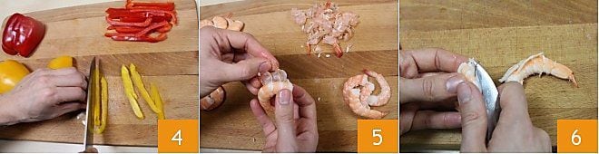 Proceda então com os outros legumes. Corte a cebolinha em tiras; descasque o gengibre e corte em pedaços; elimine o talo e as sementes das duas metades dos pimentões e corte-os em tiras 4. Descasque os camarões: você pode usar aqueles já pré-cozidos ou os frescos 5. Corte cuidadosamente o dorso dos camarões com uma faquinha e, puxando delicadamente, elimine o fio preto, isto é, o intestino 6.