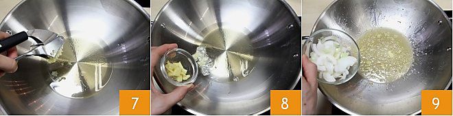 Prepare a base do refogado: coloque o óleo de semente de girassol em uma frigideira wok ou frigideira antiaderente de bordas altas e aqueça por um minuto. Coloque os dois dentes de alho esmagados ou inteiros 7, adicione o gengibre em pedaços 8 e a cebolinha cortada em tiras. Cozinhe por dois minutos para dar sabor ao óleo 9.