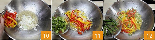 Neste ponto, adicione as tiras de pimentão fritando-as em fogo alto por dois minutos para manter sua crocância 10. Adicione os aspargos, primeiro as bases 11 e depois as pontas inteiras, e misture os ingredientes 12.