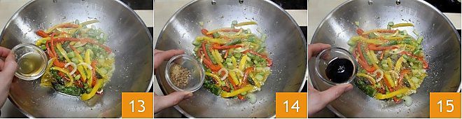 Depois de colocar todos os legumes na frigideira, regue-os com a colher de vinagre de maçã 13, depois adicione o açúcar mascavo 14 e, por fim, o molho de soja 14.