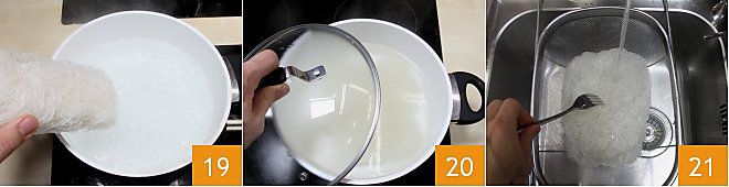 Em uma panela, leve a água para ferver e cozinhe o espaguete de soja por no máximo dois minutos com a tampa, ou siga as instruções das embalagens 19 e 20. Escorra-os e passe-os em água fria, soltando-os com um garfo para evitar que fiquem muito grudados 21.