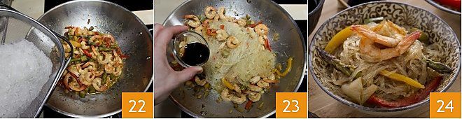 Misture o espaguete de soja escorrido diretamente na frigideira wok 22. Conclua misturando e ajustando o molho de soja ao seu gosto 23. Emprate e sirva o seu fumegante espaguete de soja com camarões e legumes 24.