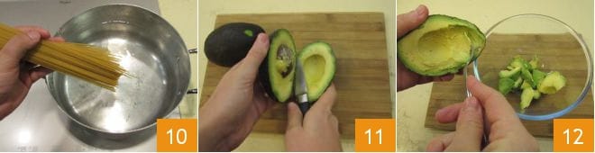 Enquanto isso, cozinhe a massa em uma panela com bastante água salgada fervente 10. Enquanto a massa cozinha, prepare o creme de abacate: corte a fruta ao meio no sentido do comprimento 11 e retire o caroço. Com uma colher, retire a polpa do abacate 12 e coloque-a em uma tigela.