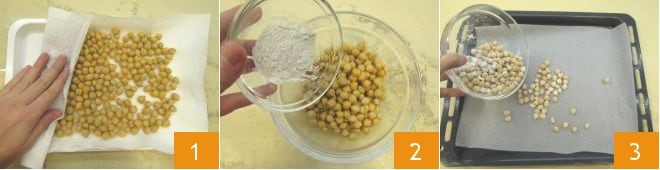 Para preparar os espaguetes integrais com creme de abacate e grão-de-bico crocante, comece secando bem o grão-de-bico com papel toalha 1. Em seguida, coloque-os em uma tigela e adicione a farinha 2. Misture bem para enfarinhar uniformemente o grão-de-bico, depois coloque-os em uma assadeira forrada com papel manteiga 3