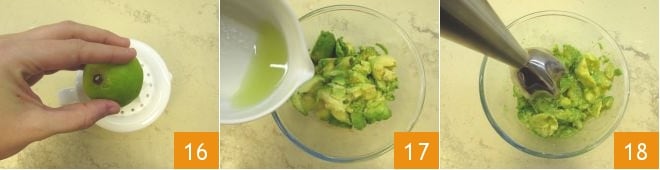 E esprema para obter o suco 16. Despeje o suco na tigela junto com o abacate 17 e, por fim, bata até obter um creme fino com um mixer de mão 18.