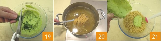Como última etapa, adicione ao creme a cebolinha, cortada em rodelas com uma tesoura de cozinha 19. Escorra a massa, que nesse meio tempo estará pronta e al dente 20, e coloque-a em uma tigela grande. Se necessário, acrescente um fio de óleo e adicione o creme de abacate 21,