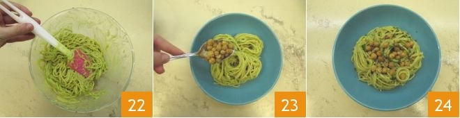 misturando imediatamente para que a massa não grude 22. Sirva os espaguetes e complete cada prato com o grão-de-bico crocante 23. Seus espaguetes integrais com creme de abacate e grão-de-bico crocante estão prontos para serem degustados 23!