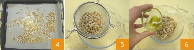 e asse a 170° por 20 minutos, até que fiquem dourados e crocantes 4. Coloque-os em uma peneira de malha fina e agite para remover o excesso de farinha do grão-de-bico 5. Transfira-os para uma tigelinha e tempere com o óleo 6