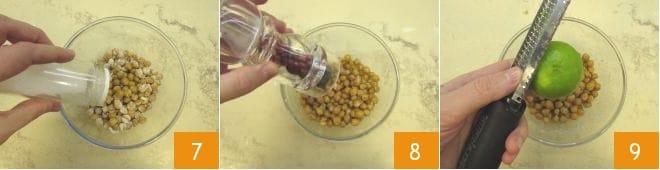 o sal 7, a pimenta rosa moída 8 e as raspas de limão 9. Misture e mantenha aquecido.