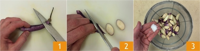 Para preparar os espaguetes com berinjela, pecorino e mexilhões, comece com a berinjela japonesa: corte as pontas 1 e fatie em rodelas finas 2. Transfira as fatias de berinjela para um escorredor, adicione sal 3 e deixe escorrer por pelo menos uma hora.