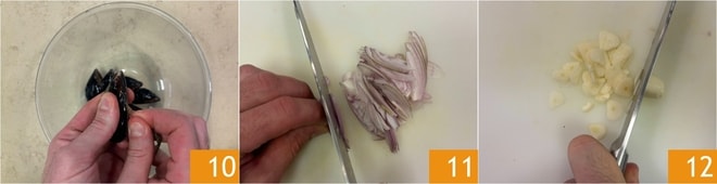 Enquanto isso, limpe os mexilhões removendo o bisso e as impurezas 10. Descasque e fatie a chalota 11 e o outro dente de alho 12.