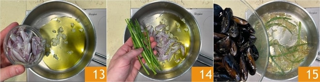 Coloque a chalota e o alho em uma frigideira com um fio de óleo 13, adicione os talos de salsa 14 e deixe apurar, depois adicione os mexilhões 15.