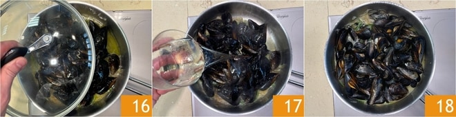 Cubra com a tampa por 30 segundos 16, depois adicione vinho branco 17 e espere que se abram 18.
