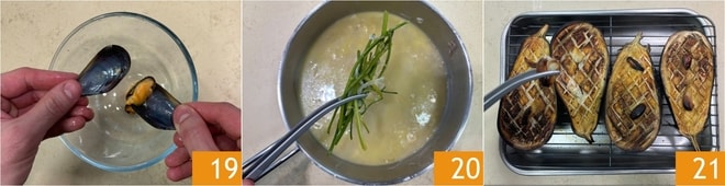 Retire os mexilhões e retire as conchas 19. Elimine os talos de salsa 20 e reserve o líquido de cozimento. Neste ponto, as berinjelas estarão cozidas, então retire do forno e elimine o alho 21.