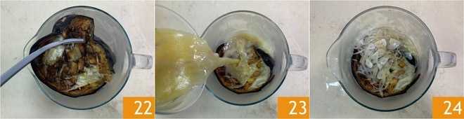 Transfira as berinjelas para um copo medidor 22, depois adicione o líquido de cozimento dos mexilhões 23 junto com o alho e a chalota 24.