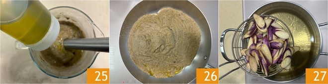 Bata com um mixer de imersão enquanto adiciona o óleo em fio 25 até obter um creme liso e homogêneo. Coloque o creme de volta na frigideira 26 e, enquanto isso, leve uma panela com água salgada para ferver. Após o tempo de escorregamento da berinjela japonesa, enxague rapidamente e frite em óleo de semente a 140° 27.