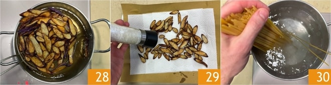 Quando estiverem douradas, escorra 28 e transfira para papel absorvente, depois adicione sal 29. Cozinhe os espaguetes por alguns minutos a menos do que o tempo indicado na embalagem 30.