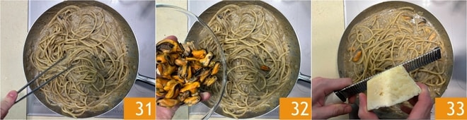 Escorra a massa e termine de cozinhá-la na frigideira com o creme de berinjela 31. Com o fogo desligado, adicione os mexilhões 32 e o pecorino ralado 33. Misture bem para incorporar tudo e sirva.