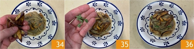 Complete o prato com as berinjelas fritas 34 e algumas folhas de manjerona 35. Seus espaguetes com berinjela, pecorino e mexilhões estão prontos para serem servidos 36!