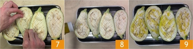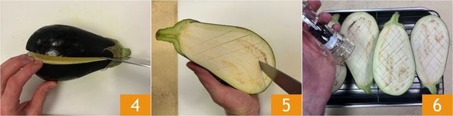Agora pegue a berinjela roxa e a berinjela zebrina, corte-as ao meio 4 e faça cortes na polpa em forma de xadrez 5. Coloque-as em uma assadeira com a parte cortada voltada para cima e tempere com sal e pimenta 6.