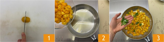 Para preparar o spaghettone com tomatinho amarelo, corte em 4 os tomatinhos previamente lavados 1. Em seguida, em uma frigideira grande, aqueça um fio de óleo, adicione os tomatinhos 2 e cozinhe em fogo alto, mexendo frequentemente. Tempere com uma pitada de sal e as folhas de manjericão quebradas à mão 3.