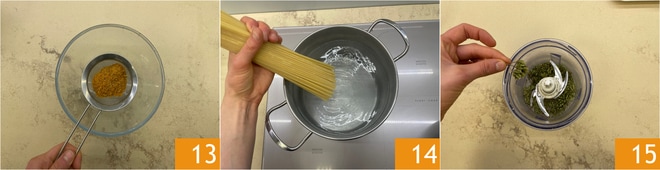 Peneire para obter um pó finíssimo 13. Neste ponto, você pode cozinhar a massa em água fervente e salgada por 14 minutos 14. Enquanto isso, prepare o outro pó para distribuir no prato final: coloque no mixer as folhas de orégano seco, removendo-as dos raminhos 15.