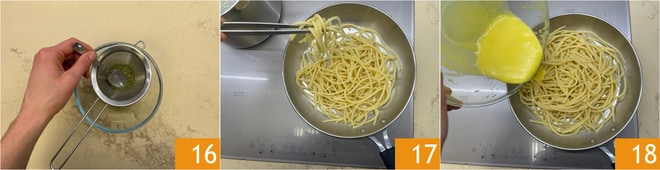 Peneire também este composto e reúna-o em uma cumbuca 16. Escorra os spaghettoni e transfira-os para a mesma frigideira em que você cozinhou os tomatinhos 17. Adicione o molho de tomatinhos 18.