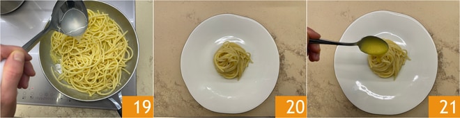 Continue o cozimento da massa com o molho por mais 2-3 minutos, adicionando água do cozimento conforme necessário para criar um belo creme 19. Sirva em ninho 20 em cada prato e cubra com bastante molho 21.