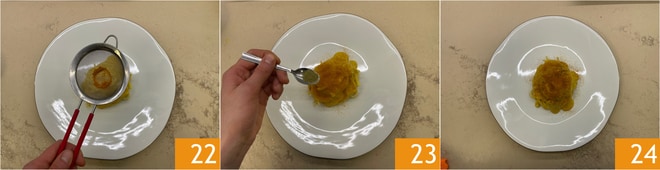 Complete com o pó de casca de tomatinho 22 e o pó de orégano seco 23. O spaghettone com tomatinho amarelo está pronto para ser servido 24!