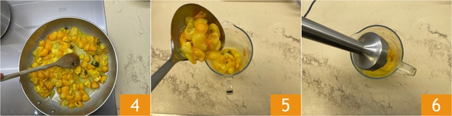 Cubra os tomates com água e cozinhe por cerca de 20 minutos; de vez em quando amasse-os com a colher 4. Depois de cozidos, bata com um mixer de imersão 5 6.