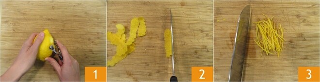 Para preparar os spaghettoni com colatura de anchovas, pistache e limão cristalizado, comece por este último. Lave os limões e retire a casca usando um descascador de batatas, sem pegar a parte branca 1. Agora, com uma faca, corte a casca em tiras finas 2, tentando obter uma espessura e comprimento uniformes 3.