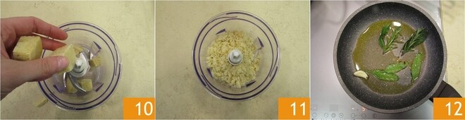Agora prepare o pão crocante. Coloque no processador de alimentos o pão duro 10 e triture até obter migalhas grosseiras 11. Em uma frigideira, adicione um fio de azeite, um dente de alho, o alecrim, a sálvia, a pimenta seca e o louro 12.