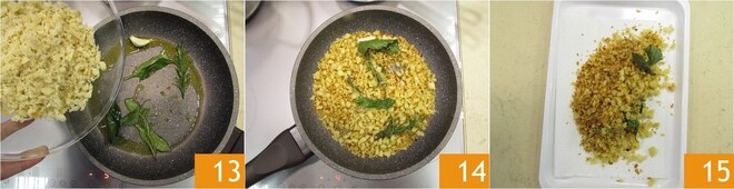 Deixe apurar no fogo por alguns minutos; assim que o alho começar a dourar, adicione as migalhas de pão 13. Misture até que o pão esteja bem dourado 14 e, quando estiver pronto, transfira para uma bandeja com papel absorvente para retirar o excesso de óleo 15. Quando o pão esfriar, remova os aromas.