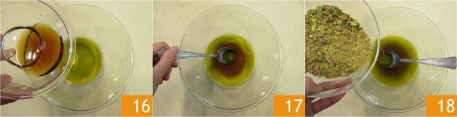 Em uma tigela, coloque o azeite e a colatura de anchovas 16. Adicione uma pitada de pimenta e misture com uma colher 17, depois adicione os pistaches tostados, grosseiramente picados 18.