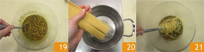 Emulsione bem a mistura 19. Cozinhe os spaghettoni al dente em água fervente sem sal 20. Escorra-os com uma pinça e transfira-os diretamente para o tempero 21.